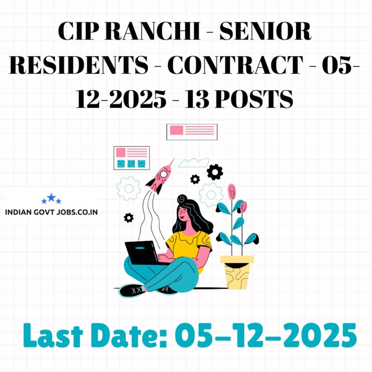 Central Institute of Psychiatry Ranchi (CIP Ranchi) invites applications via email for 13 contractual Senior Resident posts. Candidates must submit applications by 05-12-2025. Selection is through a written exam on 09-12-2025. No application fee is required. Applicants should send their…