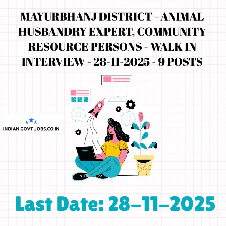 Mayurbhanj District invites eligible candidates for 9 contractual posts of Animal Husbandry Expert and Community Resource Persons through a Walkin Interview on 27-28 November 2025 at Sammilani Kaksha, Collecorate, Mayurbhanj, Baripada. The posts include 1 Animal Husbandry Expert requiring a…