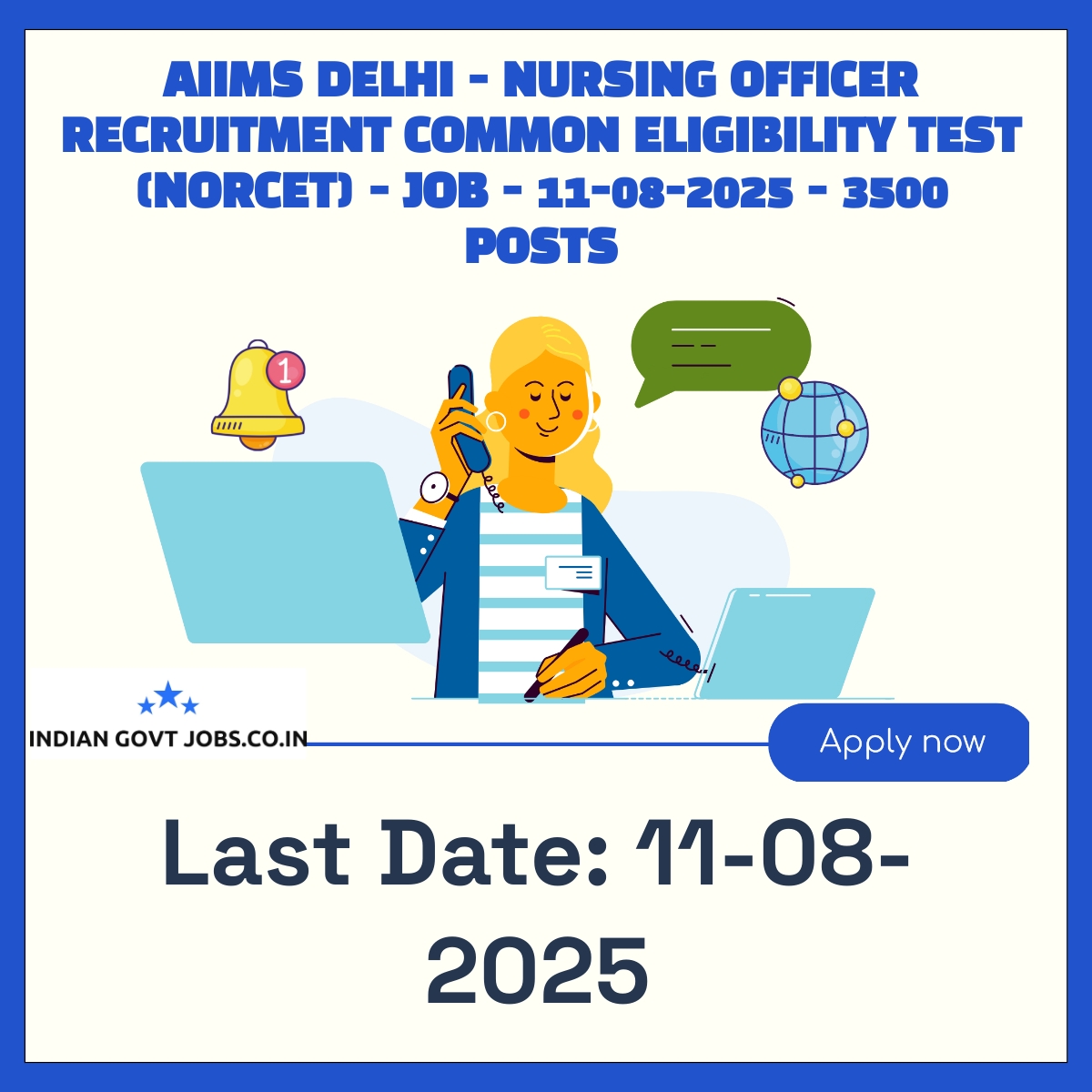 AIIMS Delhi invites online applications for 3500 Nursing Officer posts through the NORCET exam. Candidates must have BSc Nursing or Diploma GNM with 2 years experience and be aged 18-30 years. The recruitment involves two online exam stages: a preliminary qualifying test and a main merit-based test. Application fee varies by category and applications close on 11-08-2025.