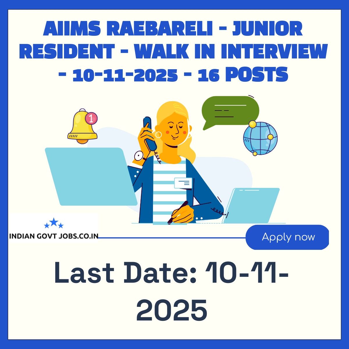 AIIMS Raebareli invites eligible candidates for a walk-in interview for 16 Junior Resident posts on a fixed-term contract basis. The interview is scheduled for 10-11-2025 at 9 AM at Medical College, AIIMS, Raebareli, Uttar Pradesh. Candidates must have an MBBS qualification and be under 37 years of age. No application fee is required. Applicants should bring a filled application form, bio-data, original documents, and photocopies for verification.