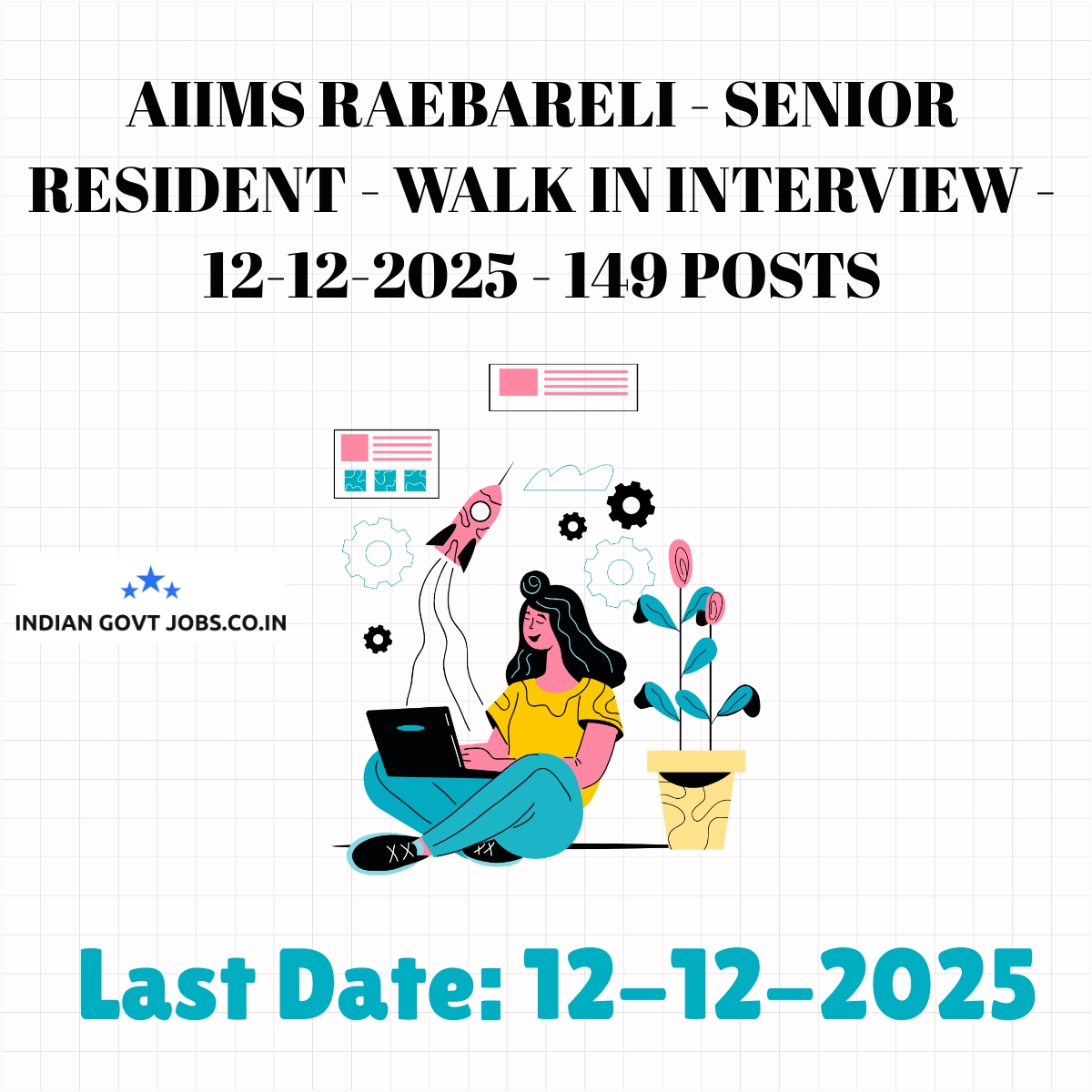AIIMS Raebareli invites candidates for a Walkin Interview for 149 Senior Resident posts on a contract basis. The interview will be held from 14-11-2025 to 12-12-2025 at 10 AM. Candidates must have MD/MS/DNB or equivalent qualifications and be under 45 years of age. No application fee is required. Selection is based on interview performance. Candidates should bring filled application forms and original documents for verification.