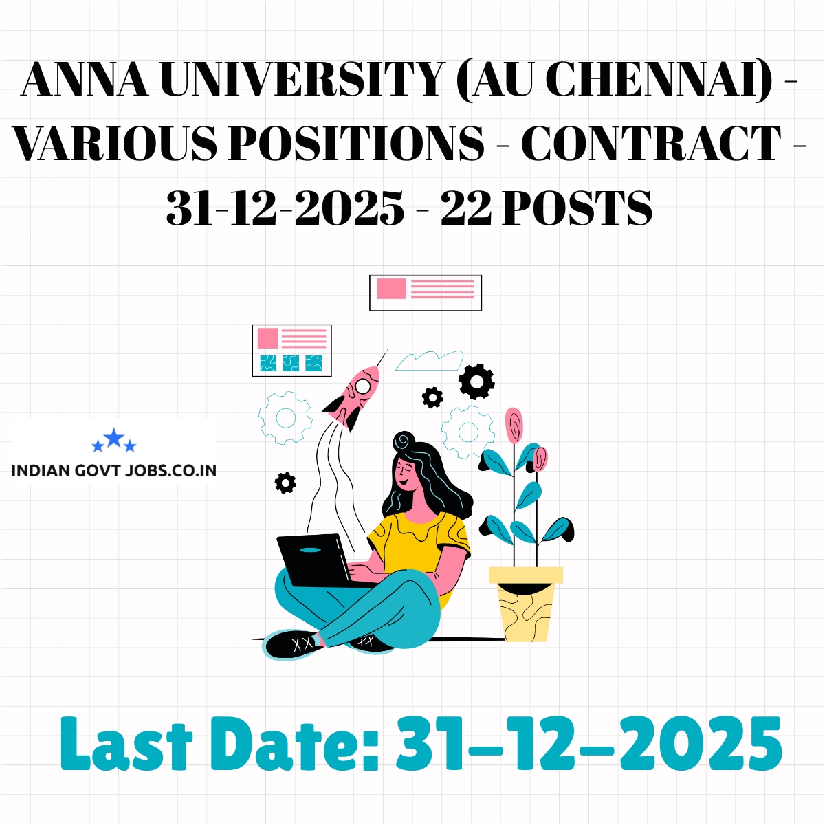 Anna University (AU Chennai) invites applications for 22 contractual posts including Project Assistant, Project Technician, and others. Candidates with qualifications ranging from Diploma to Post Graduates can apply. The last date to submit applications is 31-12-2025. Selection will be through interview. No application fee is required. Applications must be sent offline to the Director, Centre for Composite Materials, Anna University, Chennai.