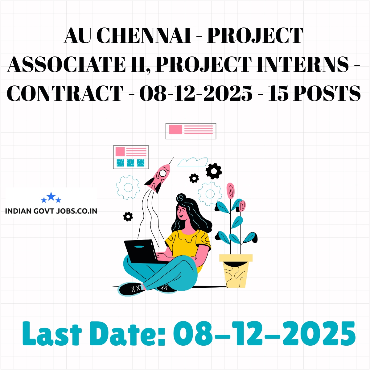 Anna University (AU Chennai) invites applications for 15 contractual posts of Project Associate II and Project Interns in Tamil Nadu. Candidates with qualifications including M.Tech, Ph.D, and engineering degrees in CS/IT or related disciplines are eligible. There is no application fee. Selection involves application review and interview for shortlisted candidates. Applications must be submitted offline with supporting documents by 08-12-2025.