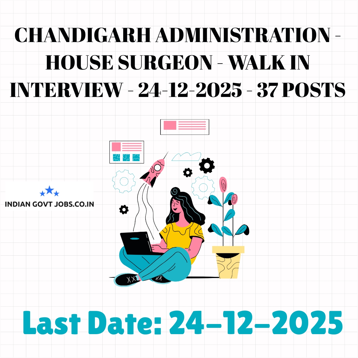 Chandigarh Administration invites candidates for a Walkin Interview on 24-12-2025 for 37 contractual posts of House Surgeon at Govt Multi Specialty Hospital. The position is on a contract basis with a salary of Rs 31500. Candidates must have MBBS qualification and be up to 30 years old as of 31-12-2025. No application fee is required. Candidates should bring a filled application, original certificates, and photocopies for verification. The interview will be held at the Conference Room, 3rd Floor, New Admin Block, Govt Multi Specialty Hospital, Chandigarh.