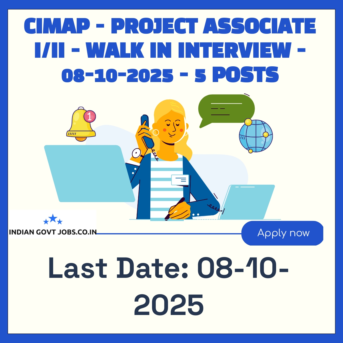Central Institute of Medicinal and Aromatic Plants (CIMAP) is conducting a walk-in interview on 08-10-2025 for 5 contract-based Project Associate I/II positions. Candidates with MSc in related fields and 0-2 years experience can apply. The maximum age limit is 35 years. No application fee is required. The interview will be held at CSIR-CIMAP Research Centre, Bengaluru. Applicants must bring filled application forms and original certificates.