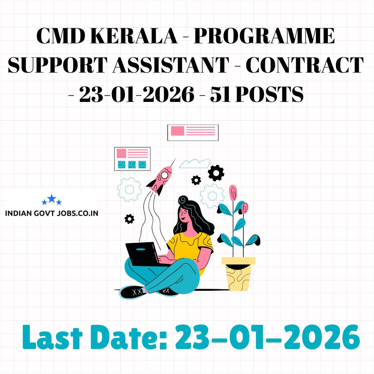 CMD Kerala invites applications for 51 contractual posts of Programme Support Assistant in Kerala. The roles include field and CRM positions supporting the Vijnana Keralam Project. Candidates must have a graduation degree and be under 35 years of age. The appointment is for six months on a contract basis, with salary up to Rs. 15,000 plus TA for field role. Applications must be submitted online via email by 23-01-2026. Selection involves screening and interview. No application fee is required.