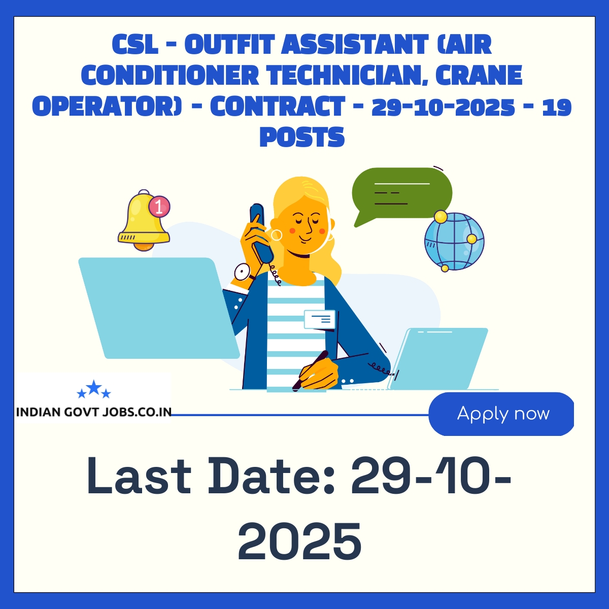 Cochin Shipyard Limited (CSL) invites online applications for 19 contractual posts of Outfit Assistant (Air Conditioner Technician, Crane Operator) in Kerala. Candidates must have 12th pass with ITI-NTC and 3 years experience. The maximum age limit is 45 years as on 29-10-2025. The pay scale is Rs. 23,300 with overtime compensation up to Rs. 5,830 per month. Selection involves application review followed by an objective and practical test. Application fee is nil for SC/ST/PWD and Rs. 300 for others. Apply online before 29-10-2025.