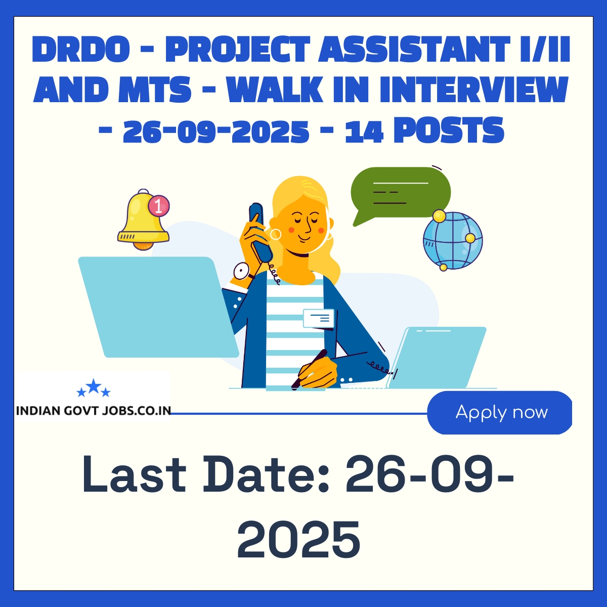 DRDO is conducting a Walkin Interview on 26-09-2025 for 14 contract-based posts including Project Assistant I/II and MTS in Delhi. Candidates must bring the application form and relevant documents. Selection is based on interview performance. No application fee is required.