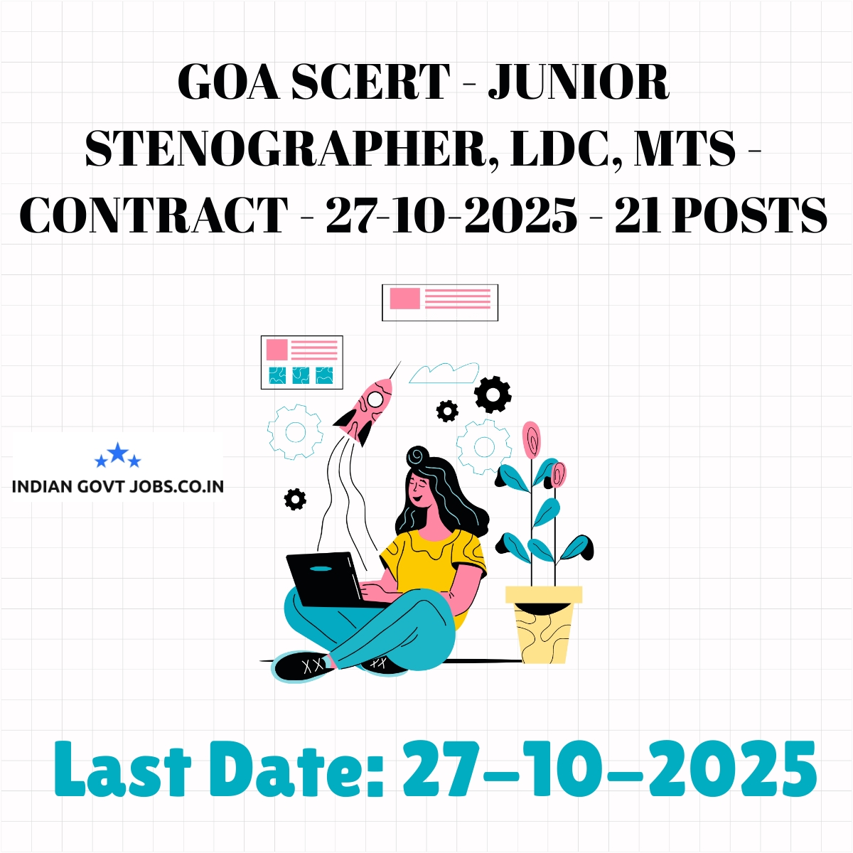 Goa Government invites online applications for 21 contractual posts of Junior Stenographer, LDC, and MTS at Goa SCERT. Candidates must meet eligibility criteria including age below 45 years and relevant qualifications. There is no application fee. Selection involves application review and written/skill tests. Apply online before 27-10-2025.