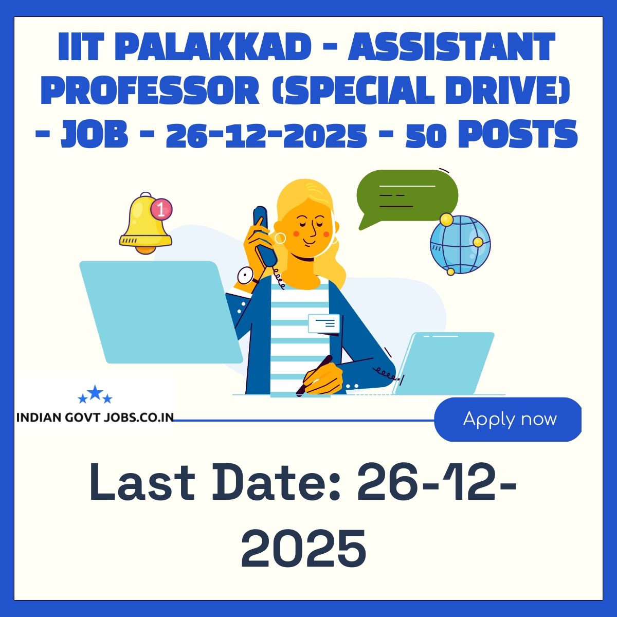 Indian Institute of Technology Palakkad (IIT Palakkad) invites online applications for 50 permanent posts of Assistant Professor (Special Drive) for SC/ST/OBC/PwD categories. Candidates must have a Ph.D. with first class or equivalent and minimum 3 years experience. The pay scale ranges from Rs. 57,700 to Rs. 1,67,400. Applications must be submitted online by 26-12-2025. There is no application fee. Shortlisted candidates will be called for interviews.