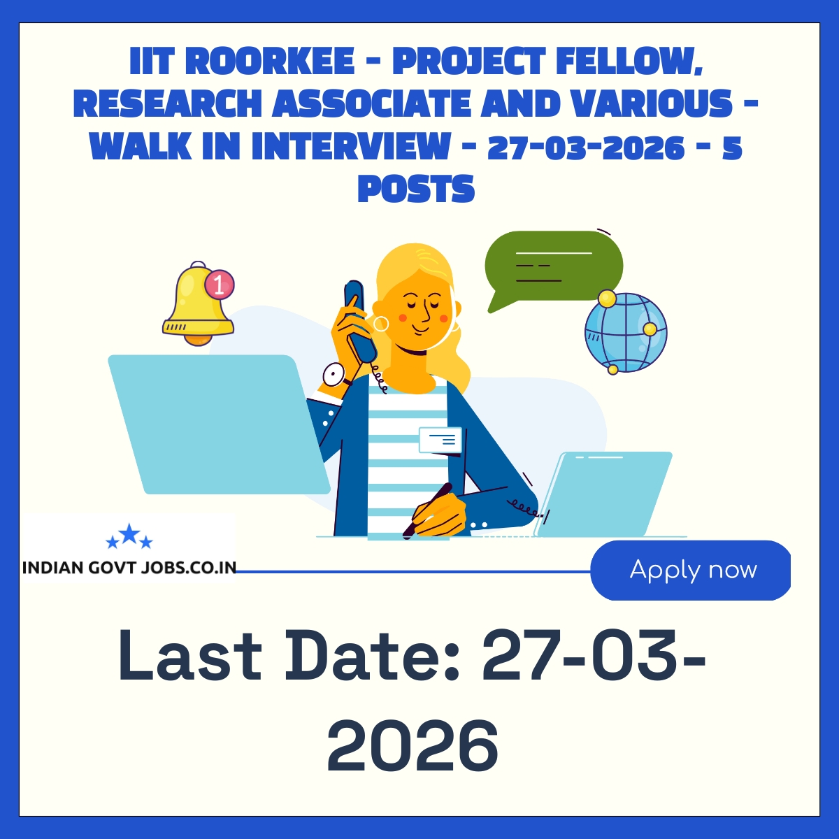Indian Institute of Technology Roorkee (IIT Roorkee) is conducting a walk-in interview on 27-03-2026 to fill 5 contract-based positions including Project Fellow, Research Associate, Project Associate, and Project Assistant (Technical) for the Development of International Centre of Excellence for Dams (ICED) project. The project is funded by the Central Water Commission, Ministry of Jal Shakti. Candidates with qualifications ranging from ITI to Ph.D. in relevant fields are eligible. Monthly salary ranges from Rs. 26,000 to Rs. 1,00,000 plus HRA depending on the position. No application fee is required. The interview will be held at ICED, IIT Roorkee, Uttarakhand.