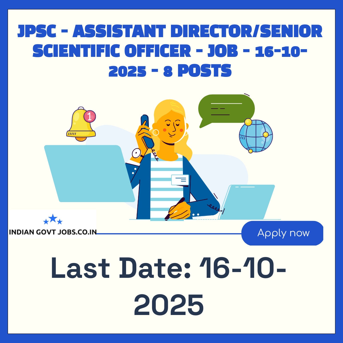 Jharkhand Public Service Commission (JPSC) invites online applications for 8 permanent posts of Assistant Director/Senior Scientific Officer (Backlog). Candidates must have MSc or BE/BTech in Computer Science with minimum 55% marks and be aged between 21 and 40 years as of 01-08-2025. Selection involves a written exam, computer knowledge test, and interview. Application fee varies by category and payment is online only. Applications must be submitted online by 16-10-2025.