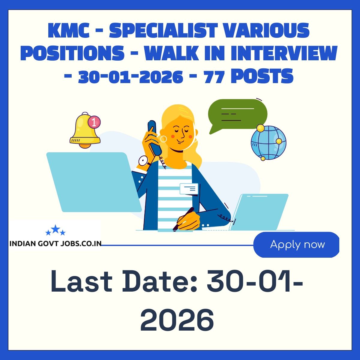Kolkata Municipal Corporation (KMC) invites medical specialists for 77 contractual posts through a walk-in interview on 30-01-2026. Positions include various specialist roles providing OPD clinical services with fixed daily remuneration. Candidates must have MBBS and relevant postgraduate qualifications, be registered with West Bengal Medical Council, and attend the interview with completed application and documents. The recruitment is on a contract basis under the XV Finance Commission Health Grant.