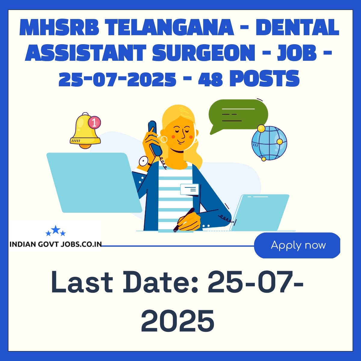 MHSRB Telangana invites online applications for 48 permanent Dental Assistant Surgeon posts in Telangana Vaidya Vidhana Parishad and Insurance Medical Services. Candidates must have a BDS degree and be registered with Telangana Dental Council. Age limit is 18 to 46 years. The recruitment process includes application review and interview. Application fee is Rs. 500 with processing fee Rs. 200, exempted for certain categories. Apply online by 25-07-2025.
