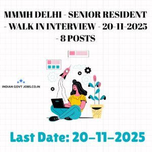 Madan Mohan Malviya Hospital Delhi (MMMH Delhi) invites eligible candidates for a Walkin interview on 20-11-2025 for 8 Senior Resident posts on a contract basis. Candidates must bring a filled application, biodata, and original plus photocopies of relevant documents. The maximum age limit is 45 years. Selection is through the Walkin interview. No application fee is required. The venue is Conference Hall, 3rd Floor, Pt. Madan Mohan Malaviya Hospital, Malviya Nagar, New Delhi-17.