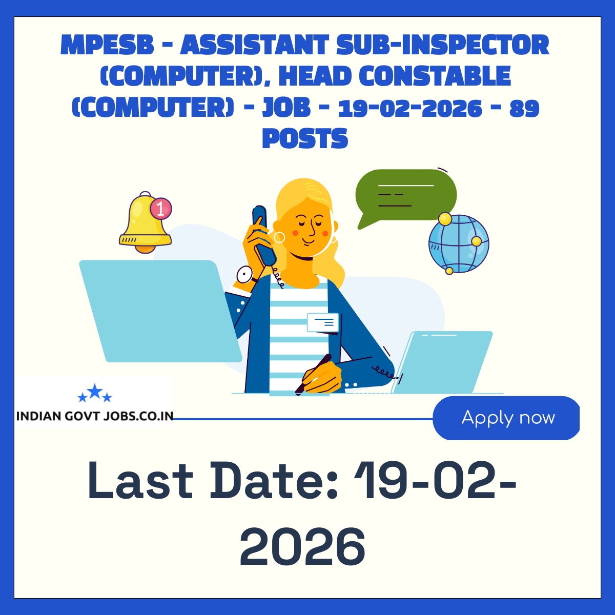 MPESB invites online applications for 89 permanent posts of Assistant Sub-Inspector (Computer) and Head Constable (Computer) in MP Police Headquarters. Candidates must have relevant degrees or diplomas in Computer/IT. Age limit is 18-33 years with relaxations up to 43 years for certain categories. Selection involves written, technical, physical, medical exams, and document verification. Application fee varies by category. Apply online between 05-02-2026 and 19-02-2026.