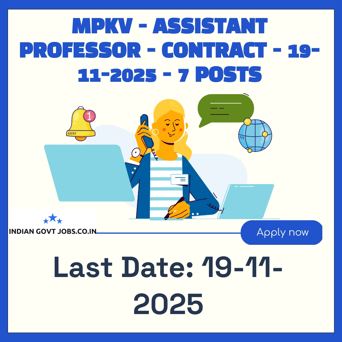 Mahatma Phule Krishi Vidyapeeth (MPKV) invites applications for 7 contractual Assistant Professor posts. Candidates with Ph.D., M.Sc, ME/MTech, or MBA with NET/SLET/SET are eligible. The salary ranges from Rs 25000 to 45000. Applications must be sent offline to the specified address by 19-11-2025. Selection involves screening and interview. A processing fee of Rs. 500 is payable online. Official notification is available online.