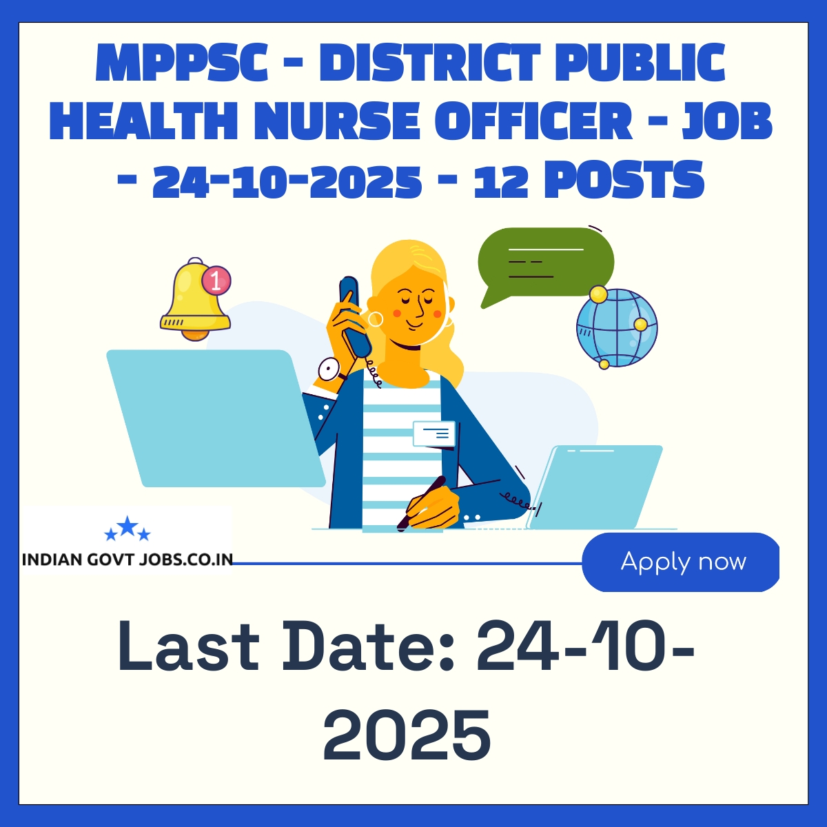 Madhya Pradesh Public Service Commission (MPPSC) invites online applications for 12 permanent posts of District Public Health Nurse Officer. Candidates must have MSc Nursing, BSc Nursing, or Post Basic BSc Nursing with at least 10 years of experience. The age limit is 21 to 40 years as of 01-01-2026. The pay scale is Rs 15600 – 39100 with a grade pay of 5400. Applications start from 25-09-2025 and the last date to apply online is 24-10-2025. Selection involves application review and interview. The application fee is Rs 250 for Madhya Pradesh candidates, payable online.