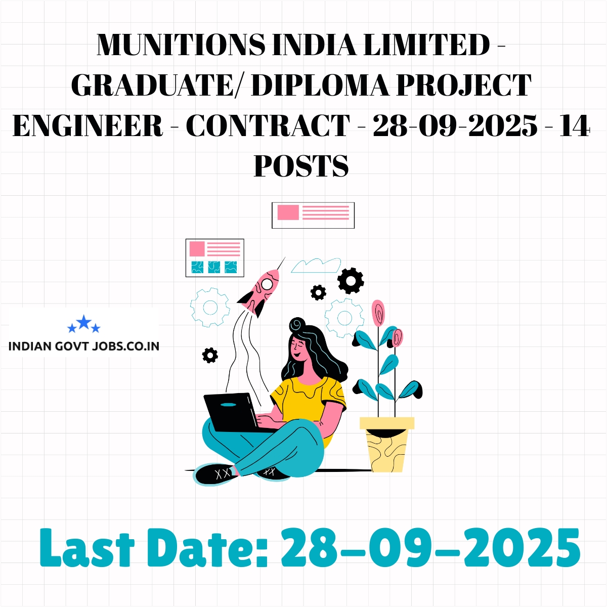 Munitions India Limited invites applications for 14 posts of Graduate/ Diploma Project Engineer at Ordnance Factory Dehu Road, Tamil Nadu. Candidates must have a Graduate or Diploma degree in Chemical, IT, or Civil engineering. The maximum age limit is 30 years as of 28-09-2025. The recruitment is on a fixed-term contract basis with a salary range of Rs 36000 to Rs 39338. There is no application fee. Applications must be sent offline to the Chief General Manager, Ordnance Factory Dehuroad, Pune by 28-09-2025. Shortlisted candidates will be called for document verification.