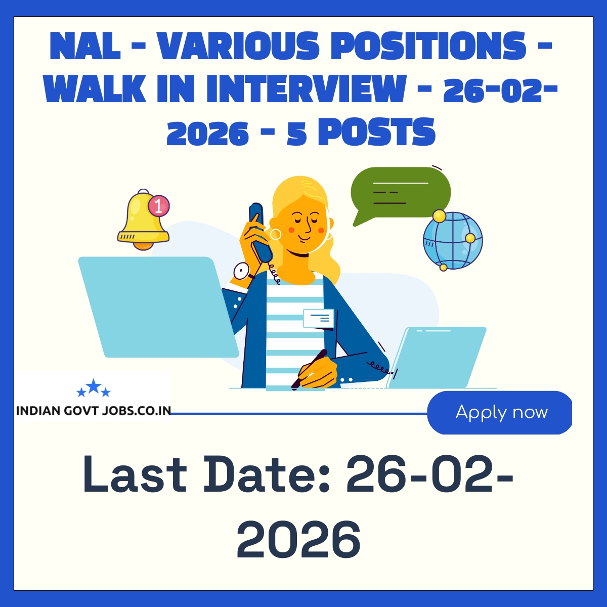 National Aerospace Laboratories (NAL), Bangalore, invites applications for five contractual positions of Project Associate and Senior Project Associate through a walk-in interview on 25-02-2026 and 26-02-2026. Candidates with relevant engineering degrees and experience in aerospace and electronics are eligible. The engagement is temporary and project-based, with a maximum tenure of seven years across CSIR labs. No application fee is required. Candidates must bring a filled application form and original documents for verification at the interview venue in Bengaluru.