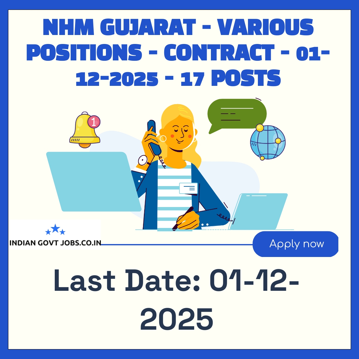National Health Mission Gujarat (NHM Gujarat) invites online applications for 17 contractual posts including Staff Nurse, Medical Officer, and others in Panchayat Panchmahal Godhra. The recruitment is on a contract basis with no application fee. Candidates must apply online by 01-12-2025. Selection involves application screening followed by interviews for shortlisted candidates.