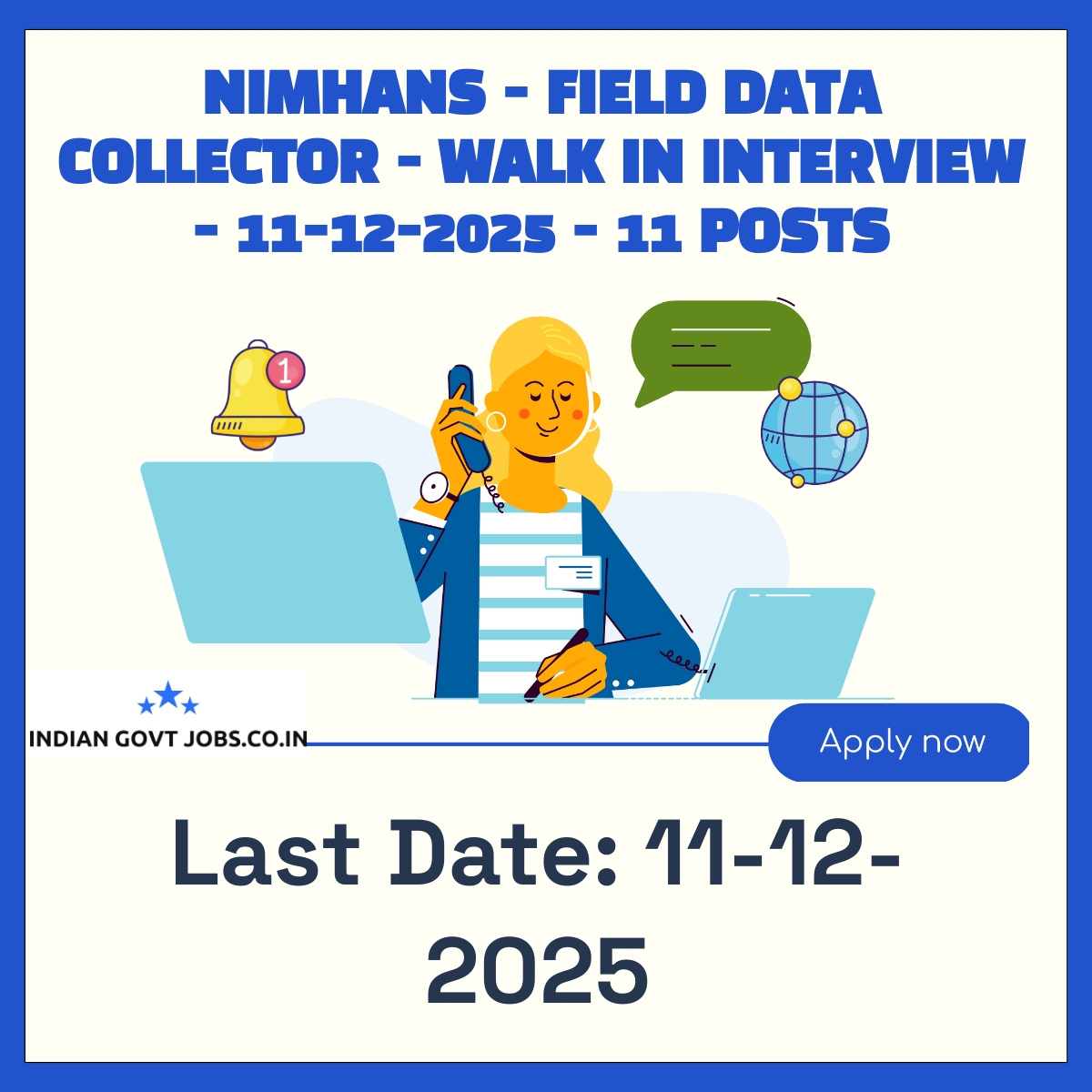 NIMHANS is conducting a Walkin Interview on 11-12-2025 for 11 Field Data Collector posts on a contract basis in Karnataka. Candidates with relevant degrees including Psychology, Social Work, Sociology, Rural Development, Women Studies, BSc, DMLT, ANM, GNM or any degree can apply. The maximum age limit is 40 years. The salary offered is Rs 20,000. No application fee is required. Candidates must bring filled application forms and original and photocopies of certificates to the venue at NIMHANS Bengaluru.