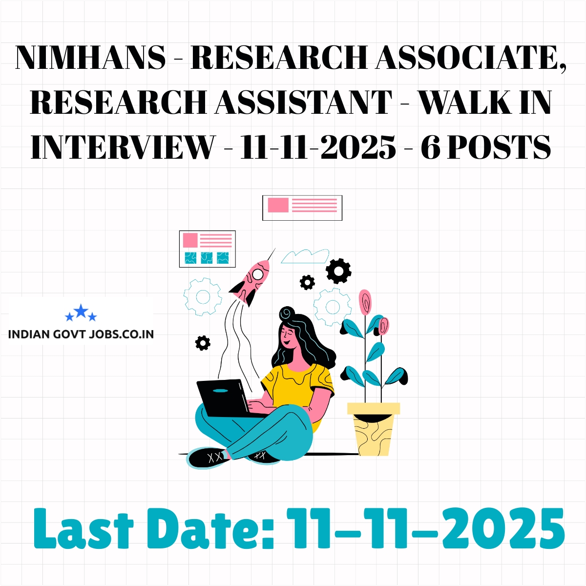 NIMHANS invites eligible candidates for a Walkin interview on 11-11-2025 for 6 contract-based posts of Research Associate and Research Assistant in Karnataka. Candidates must bring filled application forms, original and photocopies of certificates, and attend the interview at the NBRC Building, NIMHANS. Selection is through interview performance. No application fee is required.