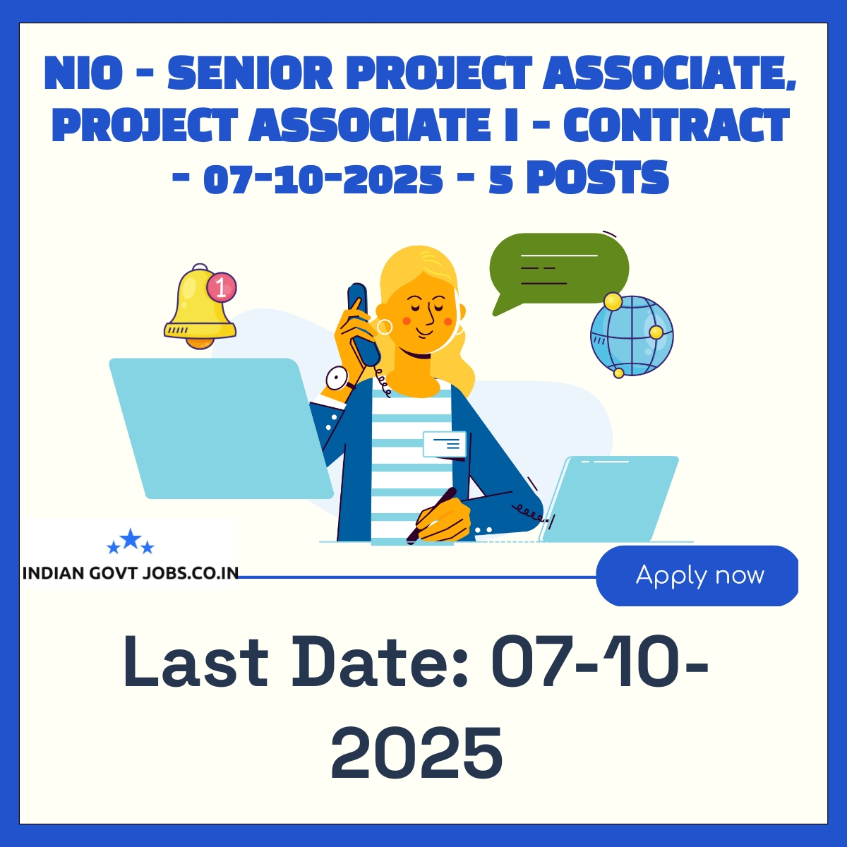 National Institute of Oceanography (NIO) invites online applications for 5 contractual posts of Senior Project Associate and Project Associate I in Goa. Candidates must have an MSc in a related field. The salary offered is Rs 25000. The recruitment process includes application scrutiny and interviews. No application fee is required. Applications must be submitted online by 07-10-2025.