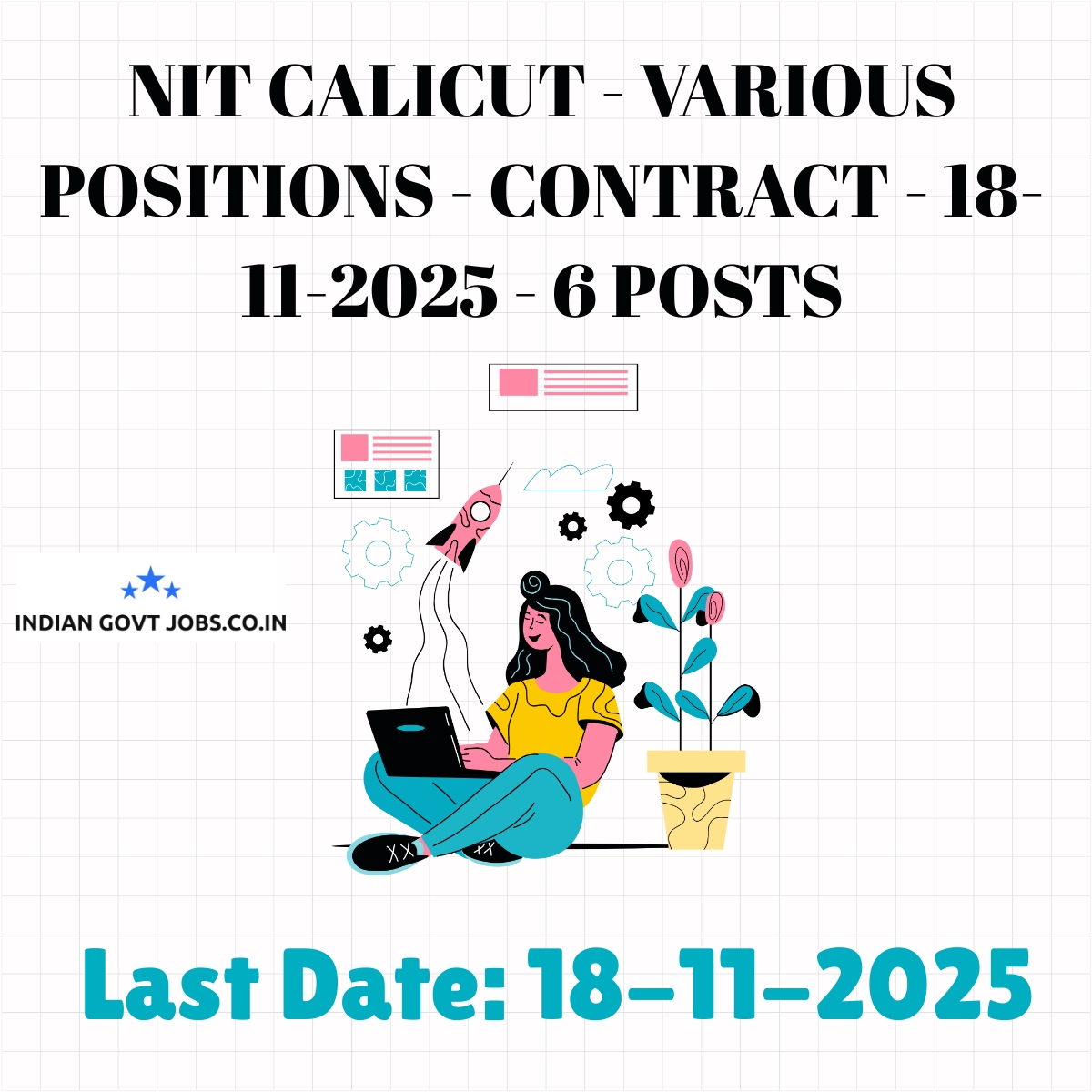 NIT Calicut invites online applications for 6 contractual posts including JRF, SRF, and various other positions in the Department of Mechanical Engineering. Candidates with qualifications ranging from graduate to Ph.D. in relevant fields can apply. The maximum age limit varies by post, up to 50 years. Selection will be through application screening followed by an online interview. No application fee is required. Applications must be submitted online by 18-11-2025.