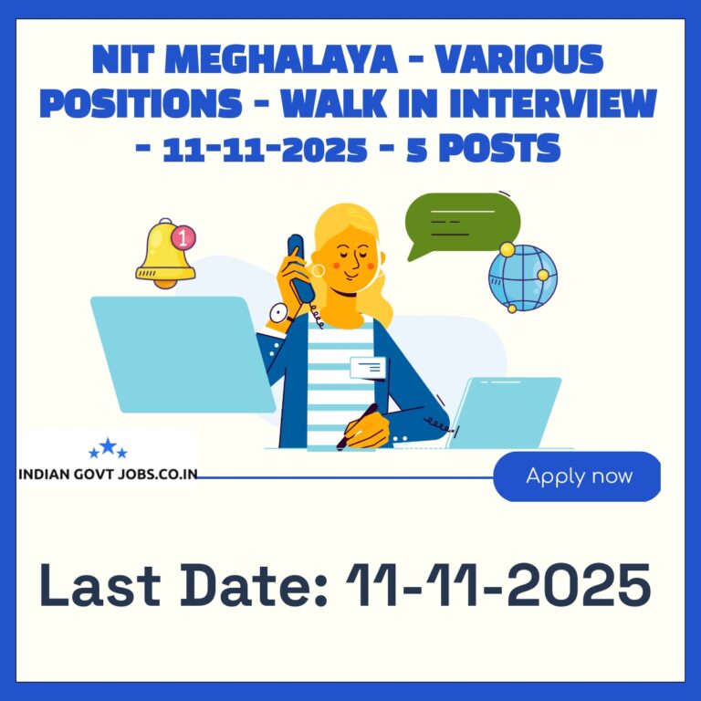NIT Meghalaya invites eligible candidates for walk-in interviews on 11-11-2025 for 5 contractual posts including Senior Research Assistant, Junior Research Assistant, and Office Assistant. Candidates must carry application forms and relevant documents. Selection is based on interview performance with preference…