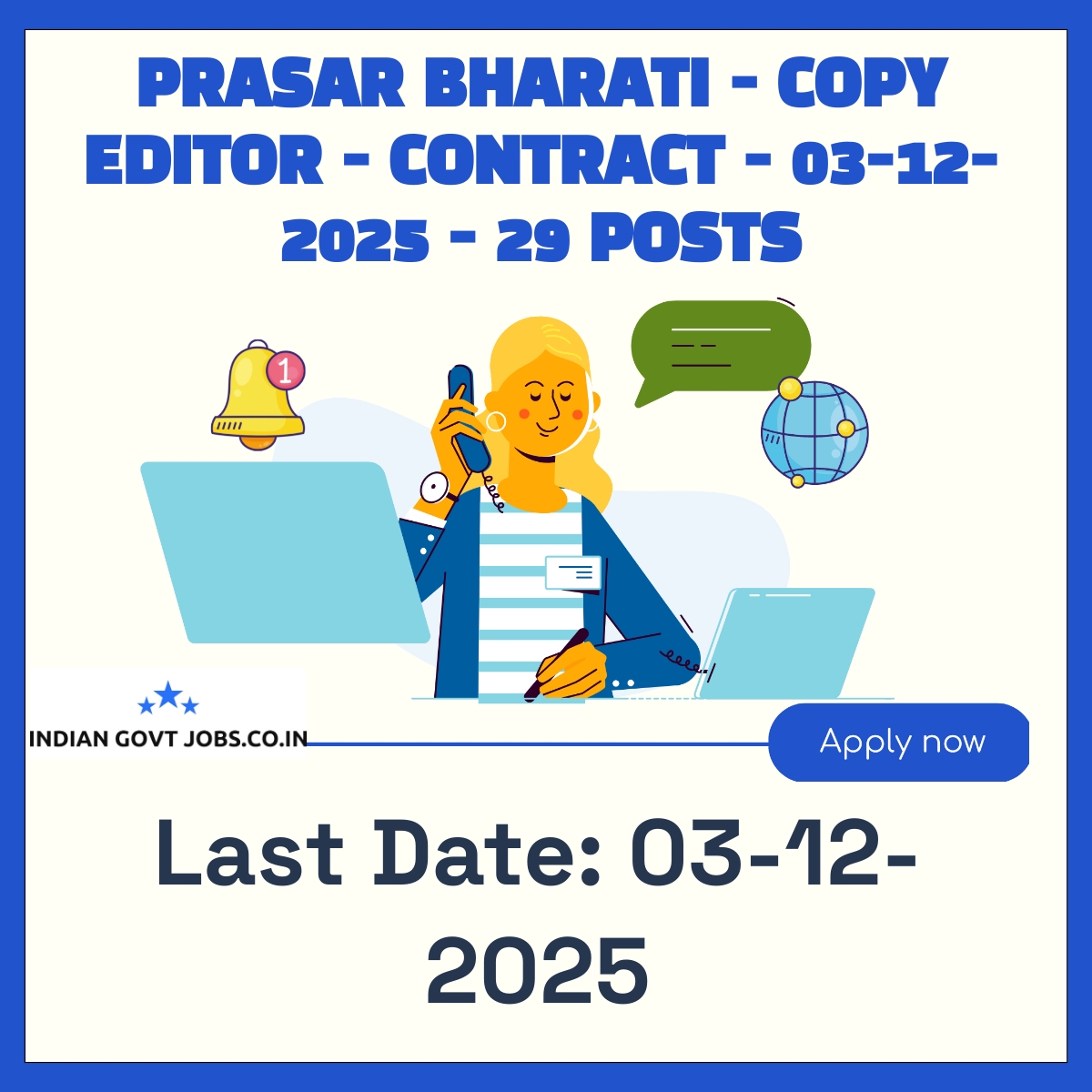 Prasar Bharati invites applications for 29 contractual posts of Copy Editor. Candidates must have a graduate degree with relevant experience or a degree/PG diploma in Journalism/Mass Communication with experience. The maximum age limit is 35 years. There is no application fee. The selection process includes application screening followed by an interview. Applications must be submitted offline by 03-12-2025 with all necessary documents. The salary offered is Rs 35000 per month.