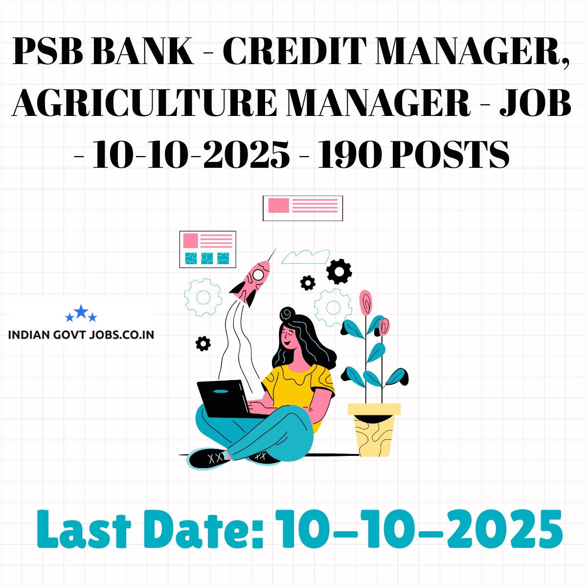 Punjab and Sind Bank (PSB Bank) invites online applications for 190 permanent posts of Credit Manager and Agriculture Manager. Candidates must apply by 10-10-2025. The recruitment involves a written test, screening, and personal interview. Minimum qualifications include graduation or professional qualifications with experience. The pay scale is Rs. 64820-93960. The job location is Delhi. Application fees vary by category and payment is online.