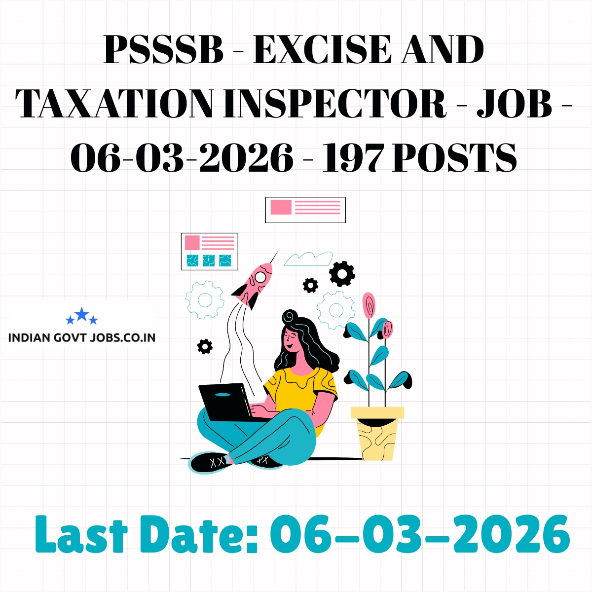 Punjab Subordinate Services Selection Board (PSSSB) invites online applications for 197 permanent Excise and Taxation Inspector posts in Punjab under Advertisement No. 01/2026. Candidates must have a Bachelor’s degree and computer literacy. The pay scale is Level 6 with a starting salary of about ₹55,000 per month. Age limits range from 18 to 37 years with relaxations up to 47 years for certain categories. Selection involves a written exam in Punjabi language and educational qualifications, followed by counselling and document verification. Applications must be submitted online by 06-03-2026.