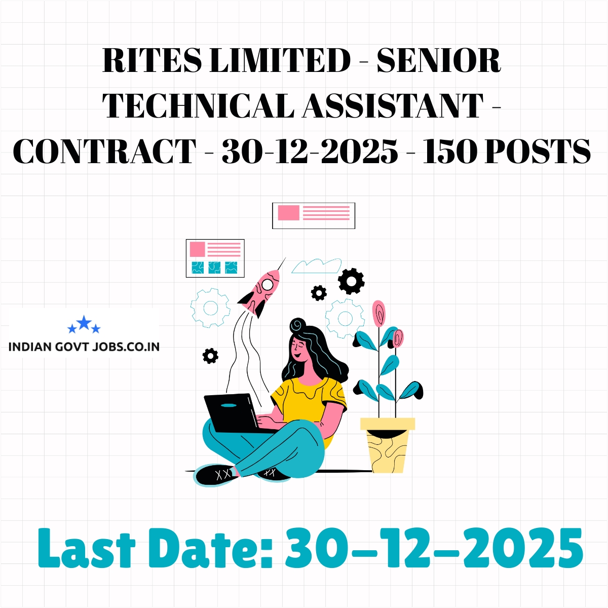 Rites Limited invites online applications for 150 contractual Senior Technical Assistant posts. Candidates must have a full-time diploma in relevant engineering disciplines with at least 2 years experience. The maximum age limit is 40 years. Selection involves a written test followed by document scrutiny. The application fee is Rs 100 for EWS/SC/ST/PWD and Rs 300 for others, payable online. Applications close on 30-12-2025.