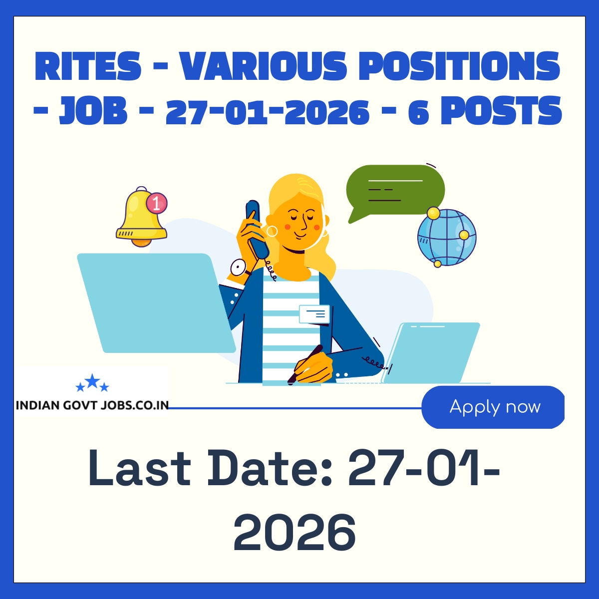 Rites Limited invites online applications for 6 permanent posts including Manager, Assistant Manager, and Senior Manager in ports, waterways, and coastal engineering fields. Candidates must have relevant Master’s degrees and experience ranging from 2 to 8 years. The selection process includes a written test, document verification, and interview. Application fee varies by category and must be paid online. The last date to apply is 27-01-2026.