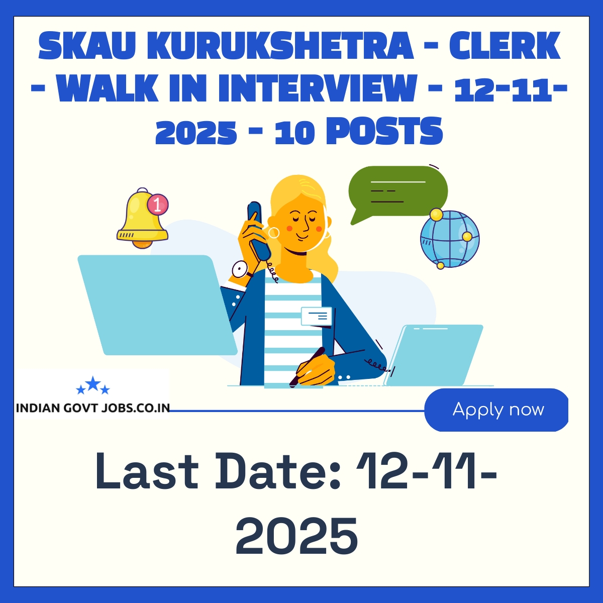 Shri Krishna Ayush University (SKAU Kurukshetra) invites eligible candidates for a walk-in interview on 12-11-2025 for 10 contractual Clerk posts. Candidates must have experience working in analogous posts and meet the maximum age limit of 56 years. Selection is based on interview performance with preference to relevant experience. No application fee is required. The interview will be held at the Conference Hall, Administrative Block, Shri Krishna AYUSH University, Sector-8, Kurukshetra.
