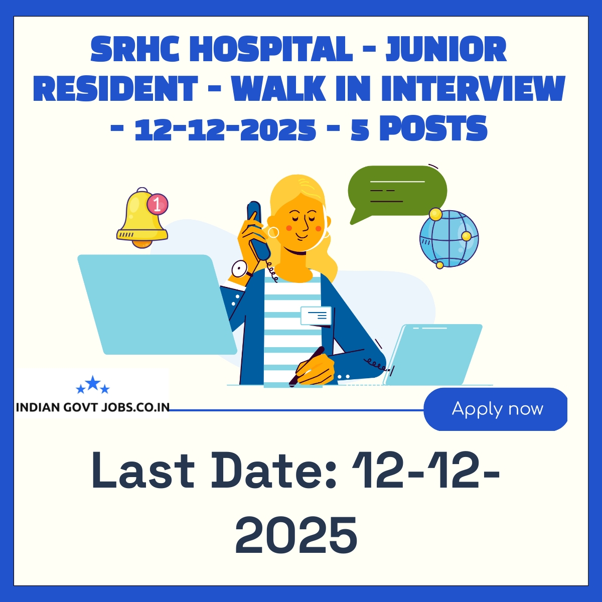 Satyawadi Raja Harish Chandra Hospital (SRHC Hospital) invites eligible candidates for a Walkin Interview on 12-12-2025 for 5 contractual Junior Resident posts. Candidates must carry the application form and relevant documents. The maximum age limit is 30 years and qualification required is MBBS. No application fee is required. The venue is Office of Medical Superintendent, SRHC Hospital, Delhi.