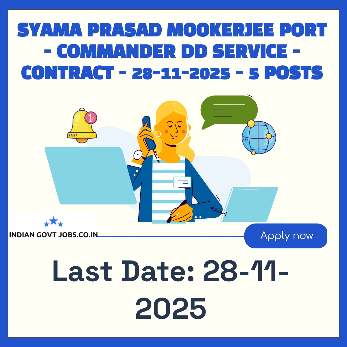 Syama Prasad Mookerjee Port invites applications for 5 posts of Commander DD Service on a fixed term contract basis. Candidates must have a Certificate of Competency as Master FG or Dredge Master Gr. I and be under 45 years of age as of 01-10-2025. Selection will be through interview after initial screening. No application fee is required. Applications must be sent offline to the Marine Department, Kolkata by 28-11-2025.